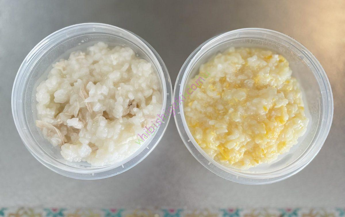 ①お粥は、お米から火にかけて……2種類!何回かに分けて食べるように!ササミがあるのでササミのお粥。少しサムゲタンのようなイメージで!