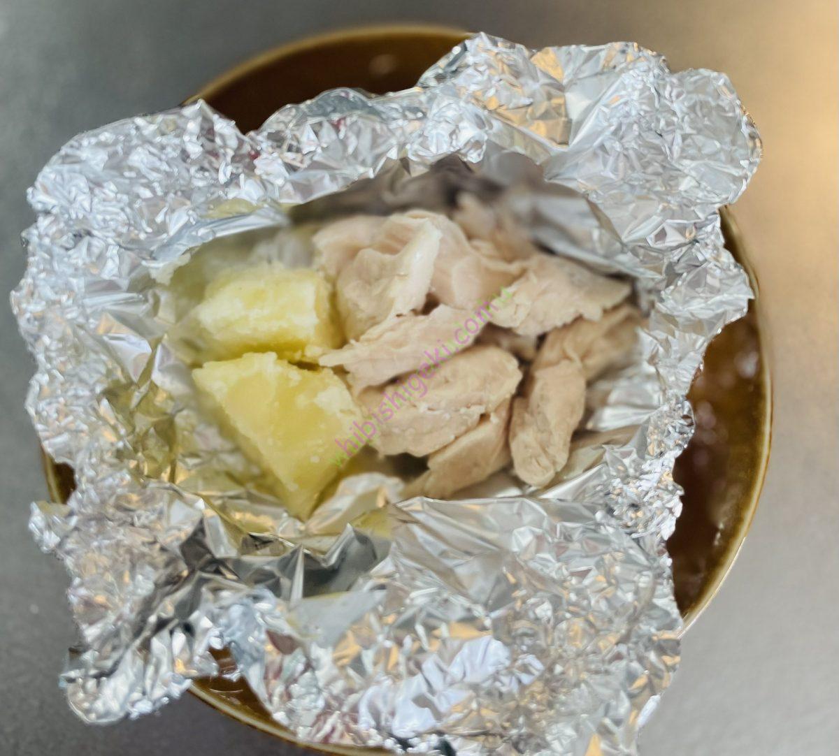 ササミは酒蒸し、じゃがいもは蒸します