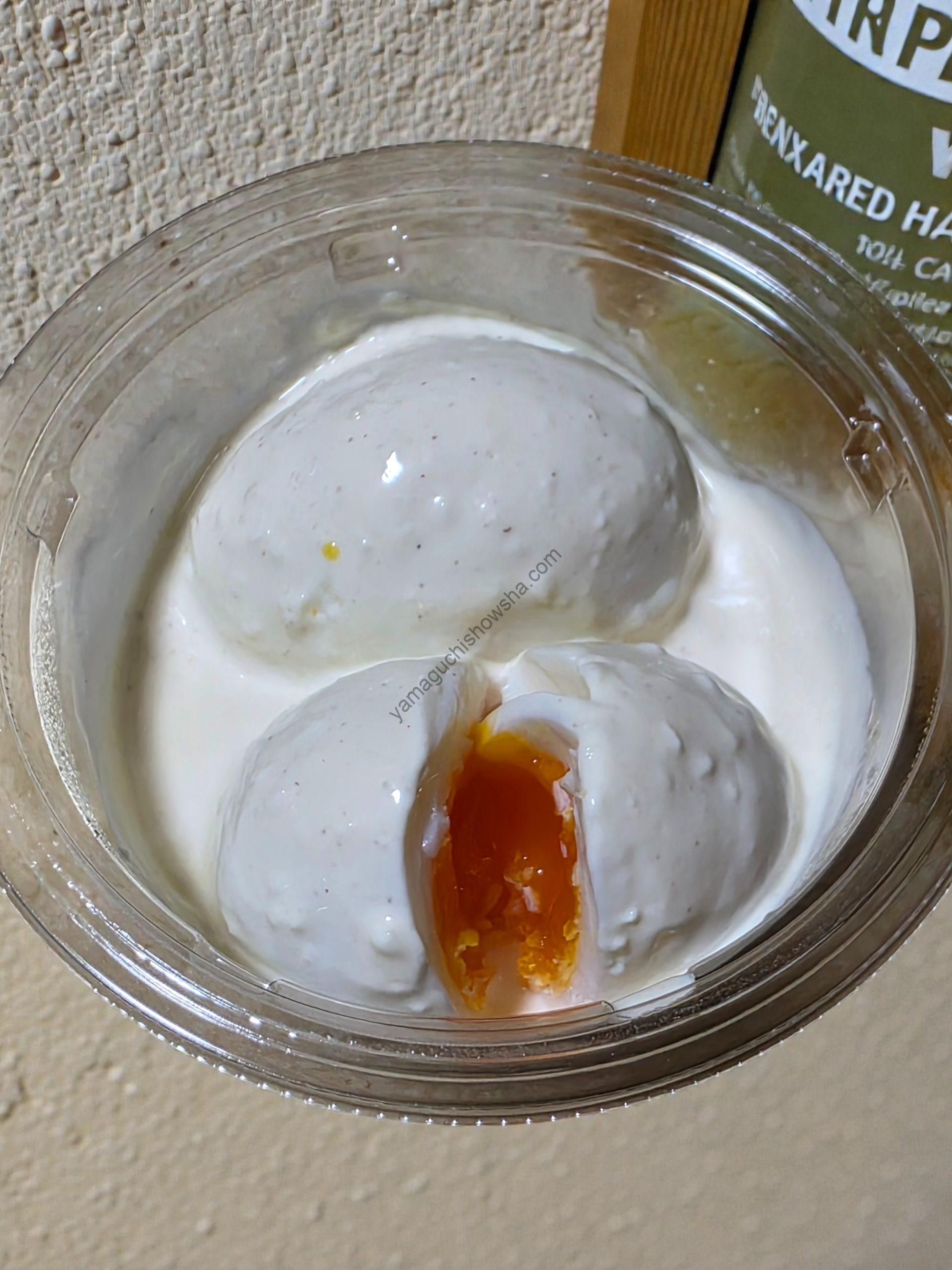 白いウフマヨは、ゆで卵をたっぷり(2個も!)使用しており、カップデリとして手軽に高タンパク質を摂取できる点が最大の魅力です。