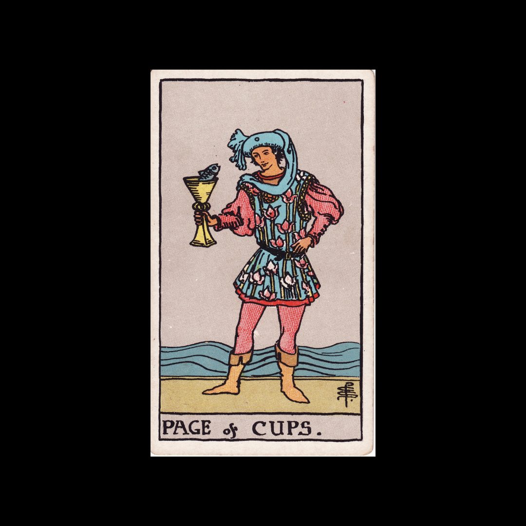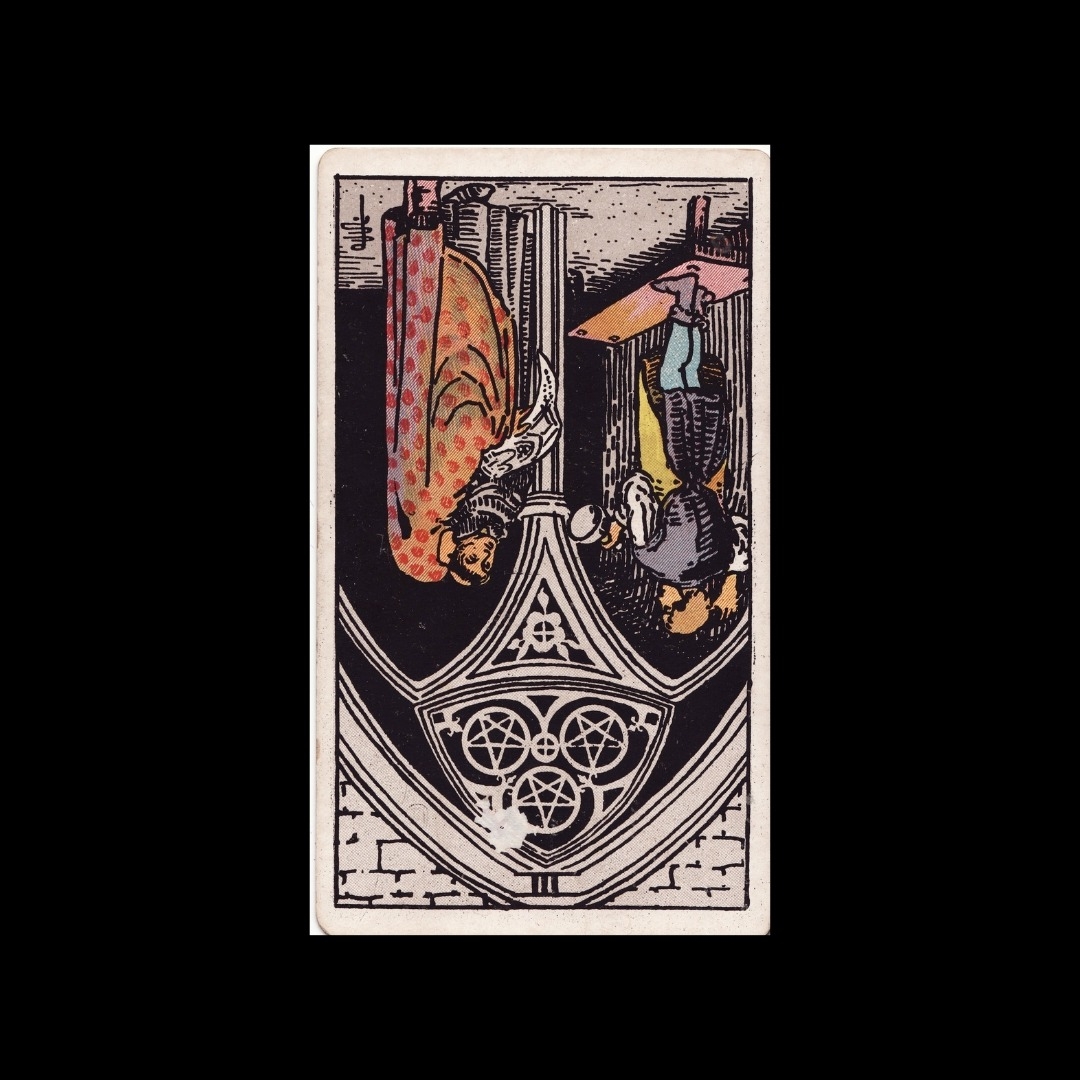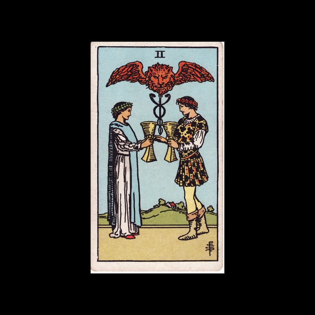 2人の人物が杯を交わし、その上には愛の象徴であるライオンと杖が描かれています。