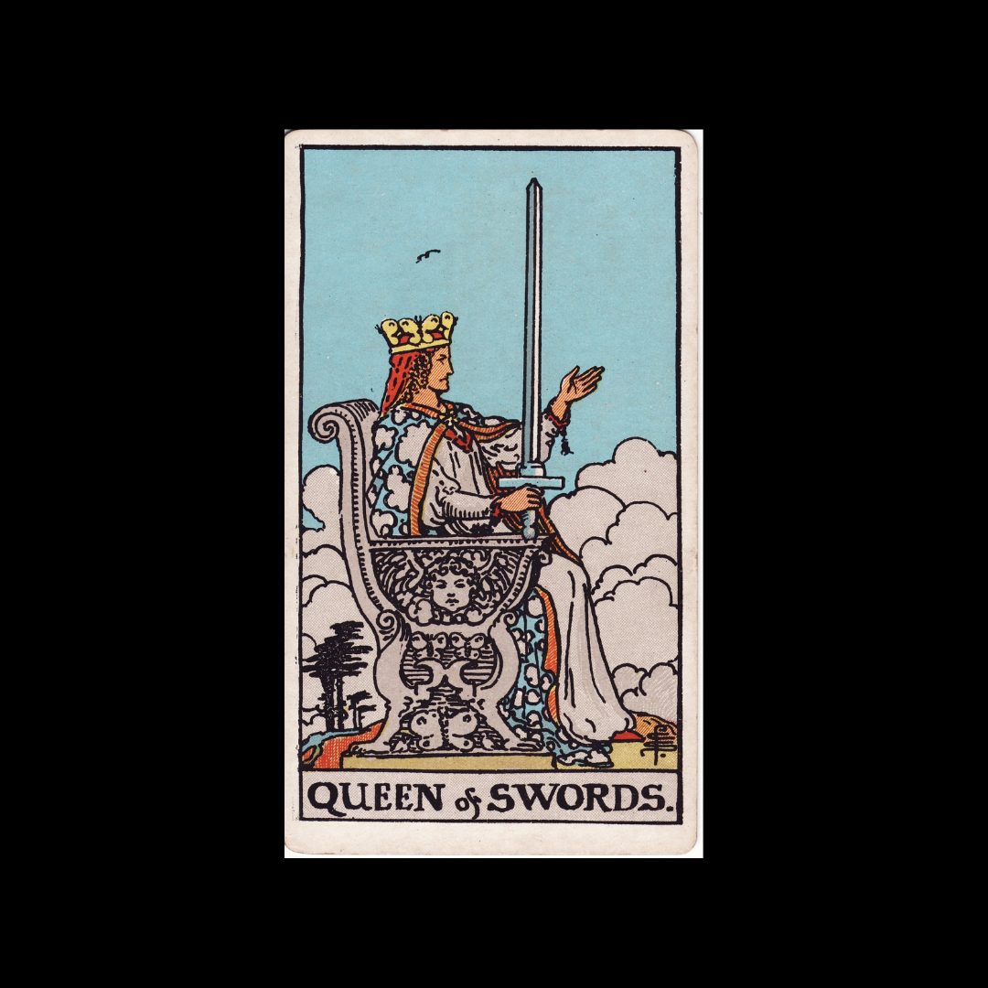 厳しい表情で剣を持つ女王ですが、その視線はどこか遠くの本質を見抜いています。