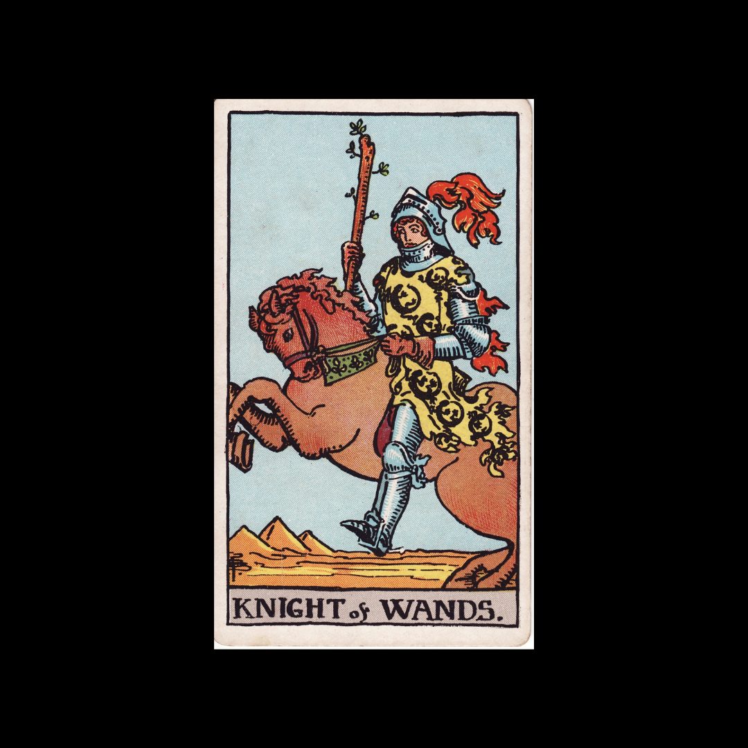 燃えるような模様の服を着た騎士が、黄金の棒を掲げて馬を走らせています。